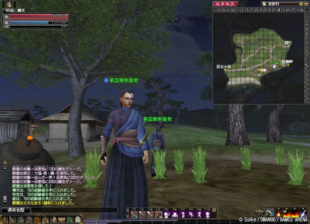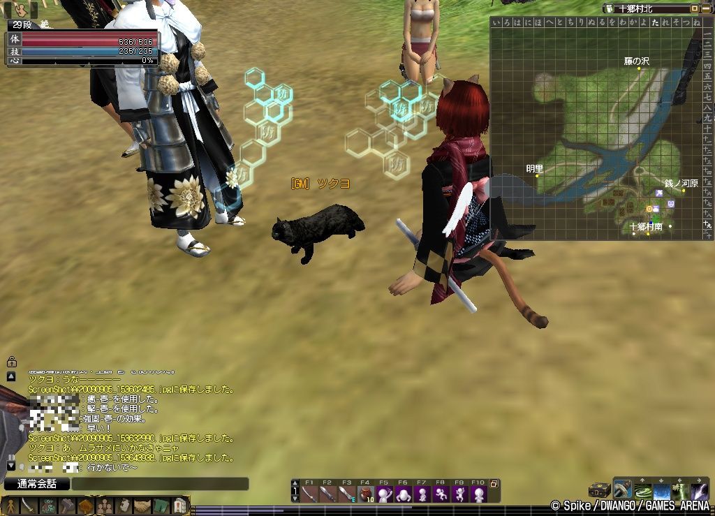 「錬金」をあげるため「萎びた油草」を入手すべく,明里で「蓑むしり」をいじめ倒し,十郷村北に戻ってきたところで,チャットウィンドウに「ツクヨ」の文字が見えたときに,イベントがあったことを思い出し,「いや,しかし,イベントはとうに終わっているはず…」と思いつつ十郷村南方面へ抜けようと走っていくと,ひとだかりが!