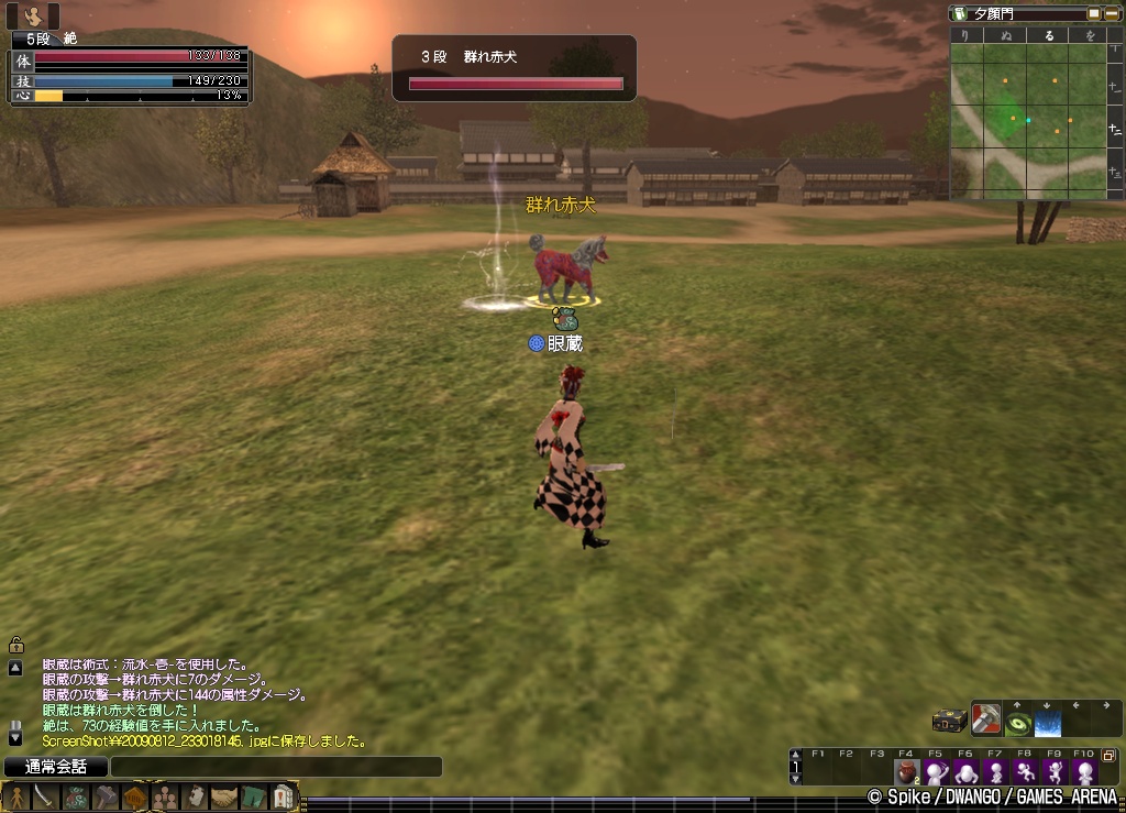 私の場合,鹿の攻撃を横歩きでかわした後,鹿のお尻が見えたら(=お尻が正面に来るか来ないか,といったときに),連続攻撃はないものと判断して,斬りつけます。2回連続の攻撃があった後は,すかさず(鹿が頭突きをしている間に)「焔-壱-」のような発動が速い術をたたきこみます。